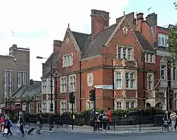 It was designed in a redbrick neo-Gothic version of the Early English style by Brierly and Demaine with enough seats for 850 and (to avoid excluding working-class worshippers) no pew rents. It was built between 1887 and 1890 and was assigned a District Chapelry by an Order in Council of 12 January 1891.[1][2] The church's parish hall and parsonage (designed in 1892 by Robert William Edis) survive at the corner of Buckingham Palace Road and Elizabeth Street.[2] A merger back into the parish of St Michael's Church, Chester Square was proposed in September 1919.[3]