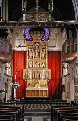 Although the first vicar, the Rev. J. A. Aston, was considered an Evangelical, his successors, the Rev. J. P. Waldo and the Rev. G. Sutton Flack, had steered the parish to a more High Church stance by the late nineteenth century. In 1887 the architect Hugh Roumieu Gough added a distinctive octagonal vestry and lady chapel. Stained glass windows designed by Nathaniel Westlake were installed in the 1890s. Further changes were introduced following the installation of the Rev. Lord Victor Seymour as vicar in 1900: the architects George Frederick Bodley and Walter Tapper erected the reredos in gilded wood behind the high altar, as well as galleries for the choir and organ. Alterations continued to be made during the twentieth century, particularly in the 1930s.[2][3]