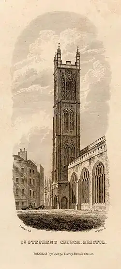 It was built, on the site of an 11th-century church, in the 14th century and rebuilt around 1470. The tower and east window were paid for by John Shipward, four times Mayor of Bristol, who died in 1473,[2] the tower being built by the mason Benedict (or Benet) Crosse. The site was on the banks of the River Frome, which was diverted in the 1240s to create Bristol Harbour.[3] The clerestory was repaired after a storm in 1703. The aisle and east windows were restored in 1873.