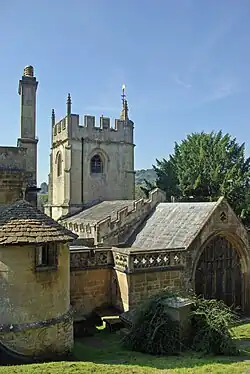 The church was built between 1490 and 1498 by John Cantlow, Prior of Bath Abbey and took the place of an older Norman church.[4] However, there was a common tradition that a weaver was the founder of the church, and an escutcheon bearing a weaver's shuttle can be seen[nb 1] on the outside of one of the north battlements of the tower.[5] It is believed that there was originally a Saxon chapel on the site. The church was commonly called Old Widcombe Church and used to be the principal church of the parishes of Widcombe and Lyncombe. The Domesday survey of 1086 shows a small settlement around the church although no trace of it remains.[6]