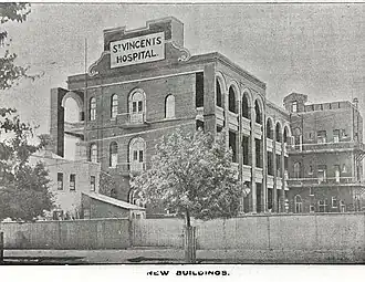 St Vincent's Hospital was opened in 1893 as a Catholic hospital owned and operated by the Sisters of Charity. Initially conceived as a branch of the Sydney institution of the same name, the hospital was intended to be a charitable institution, which was hoped would help bolster Melbourne's minimal health care. This idea was given avid support by Melbourne's Catholic Archbishop Dr Thomas Carr, who welcomed the idea of a hospital to take care of the 'poor and sick and abandoned children... the young girls of poor parents and servants...'[2] These ideals corresponded directly with prevalent Victorian ideas of benevolence, which were particularly popular with the middle classes.[3] In these early days, the hospital was quite small, occupying three terrace houses in the corner of Victoria Parade and Regent Street (now occupied by the west end of the Healy Wing), with room for less than 100 beds.[4] Though located very centrally on the edge of the CBD, the suburb beyond, Fitzroy, had some of poorest areas in the city, and the site had been deliberately selected by the founding sisters of the hospital, with many of the poorer residents taking advantage of the advent of a charitable hospital opening up on their doorstep.
