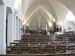 The church was built at a cost of £11,700.[1] It still has many of the original fittings designed by Wells as well as contemporary art by Eric Gill.[4] Congregational seating was made by Edward Gardiner[5] who, earlier, had a partnership with Ernest Gimson.