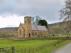 The church is built of stone with a Welsh slate roof. It consists of a nave, a chancel with a north vestry and a southwest tower with a gabled south porch. The tower has two stages, a chamfered plinth, buttresses, slit vents, paired bell openings with impost bands, and a stepped embattled parapet on a dentilled base. The windows in the church are lancets, and the east window has three lancets under quatrefoils. Inside, there are 17th- and 18th-century brass memorials, a broken Mediaeval graveslab and some other Mediaeval stones. The font probably dates from the 17th century.[1][3][4]