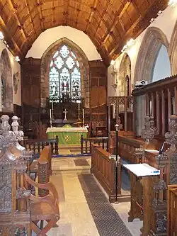The church is built pf magnesian limestone, with roofs of stone slate and lead, and consists of a nave with a clerestory, north and south aisles, a south porch, a chancel with a south vestry, and a west tower. The tower has three stages, diagonal buttresses, a two-light west window, a floor band, two corbel tables, two-light round-headed bell openings, and an embattled parapet with crocketed pinnacles. The north aisle is also embattled, and at the east end is a three-light straight-headed Perpendicular window. Inside, there is a piscina, two 17th-century wall tablets, a 13th-century square stone font with a wooden cover dating from 1669, a communion rail from 1664, and several stained glass windows designed by Charles Eamer Kempe.[2][5]