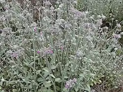 The stems and leaves are whitened with a dense layer of woolly hair on the surface, persisting at maturity. The leaves are moderately sized (to 2.5 x 2 cm), oval, and crenate-serrate toothed. Its flowers are in 1-2(4) well-separated whorls on the upper parts of the stems. The flowers are pale to moderate purple, with stronger markings, each very short-stalked, with a woolly-covered calyx whose 5 lobes are not strongly spiny-ended, and at maturity these lobes do not recurve out but remain erect or a little spreading.[2]