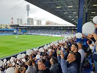 East stand was rebuilt (an all seated stand replacing the entire East standing section) with works finishing in early April 2017. The capacity of east stands is 4650 seats.[4][5][6] The East stand was funded entirely by club supporters and local businesses.[7][8] United States midfielder Mix Diskerud donated funds to the project by buying 50 seats for the North stand as well as two ten year passes for East stand.[9][10] Former club managers and players the likes of Amar Osim, Edin Džeko, Ibrahim Šehić and Semir Štilić among others, also donated.[11] Regional clubs also supported the project, with donations coming from Dinamo Zagreb.[12][13]