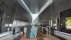 The new design contrasts a straight side against a curved opposite side.[25] According to WOHA, the change is just rotating the old design on its side, with the bridge changed to the curved side and the ground being the straight vertical side.[24] The curve side and the grey colour scheme draws reference to the old National Stadium, which has been demolished to make way for the current Singapore Sports Hub.[23][25] The station has a grand spacious interior inspired by European train stations built in the 19th century,[24] with the skylight naturally illuminating the platforms to make them visually appealing and eliminating the need to have excessive signage to navigate around.[23][24][25] The station exterior was cladded with ribbed aluminium to make the material ambiguous; making them look soft or hard depending on light conditions and time of the day.[24][25]
