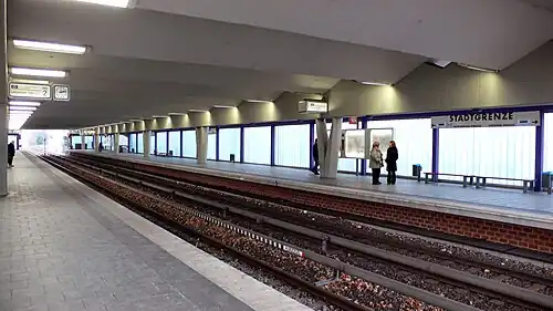 Stadtgrenze station is a Nuremberg U-Bahn station, located on the U1. Although it is officially tagged Nuremberg Stadtgrenze, its buildings are located in Fürth. Stadtgrenze means town limit in German.