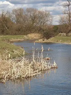 Staines Moor consists of alluvial flood meadows, the King George VI Reservoir, the Staines Reservoirs and a stretch of the River Colne.[5] Three of the six main distributaries of the River Colne run southward through it. The moor consists of rich alluvial soil on a bed of clay, a soil which is much more thick and naturally fertile compared with most of the patchy humus in the topsoil in the large historic parishes to the east such as Ashford, Stanwell, Harmondsworth, Bedfont and Feltham, which have thin, less moist humus on gravel-rich clay, formed by the ancient terraces of the Thames in the same way as the inland parts of the riverside parishes. As such rich pasture is the primary use of the land. Meads would be a more accurate term, as moor implies stony land or waste (infertile land). In the far south of the area mill mead was between two stream channels of the river, where the shopping centre Two Rivers has been built.[6]