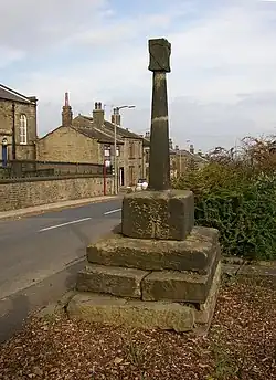 On the roadside across from St Andrew's Church stands the Stainland Cross, relocated here in the twentieth century. It represents a saltire carved on a block of stone. The block is scooped out in the form of a cup but the cover that was formerly attached to it has been removed. The column is circular and plain without any of that rich, strange sculpture or scroll ornament which antiquarians generally attribute to Saxon or Danish sculptures. Its height from the base to the top of the sculpture is about 10 feet (3.0 m), the column doesn't exceed 5 feet (1.5 m). Neither history nor tradition have preserved the date or purpose of its construction.