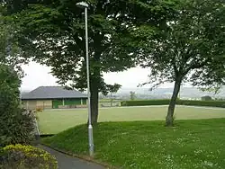 Stainland Bowling Green, with the pavilion. The cricket ground is beyond the pavilion