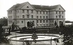 ![]() Pre-war view of a school in Ostrzeszów, one of the buildings occupied by the Dulag transit camp for Polish POWs and civilians | |