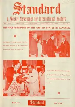 The Standard was an English-language weekly newspaper whose first issue was published in Thailand on 8 June 1946.[1] On 26 February 1966, starting from issue no. 1000 it was renamed Standard International until it was merged on 14 April 1968 with Bangkok World, Sunday Magazine Section to form Standard Bangkok magazine.[2][3][4] The Standard presented a summary of local and international news and featured articles on domestic and foreign affairs. It emphasized news of society and the royal family. It was widely read by foreigners and English-speaking Thai for its coverage of social events.[5][6]
