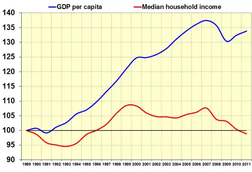 The US has... a per capita GDP [PPP] of $42,000... The [recent] onrush of technology largely explains the gradual development of a "two-tier labor market"... Since 1975, practically all the gains in household income have gone to the top 20% of households... The rise in GDP in 2004 and 2005 was undergirded by substantial gains in labor productivity... Long-term problems include inadequate investment in economic infrastructure, rapidly rising medical and pension costs of an aging population, sizable trade and budget deficits, and stagnation of family income in the lower economic groups.[47]