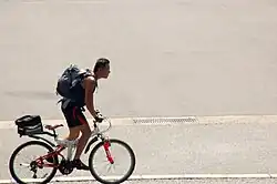 Standing cycling is less efficient especially at lower intensities.[2] One study found that both positions have equal time to exhaustion at 86 V̇O₂ max, while standing up had higher time to exhaustion above 94 percent V̇O₂ max.[3] A 2018 study in elite male cyclists found that standing did not affect energy cost but increased mechanical cost including rolling resistance power, rolling resistance coefficient, and lateral sways, resulting in an overall 4.3 percent increase in power needed to maintain the same speed.[4][5] A 2017 study found that people spontaneously stand up when cycling to minimize muscular effort.[6]