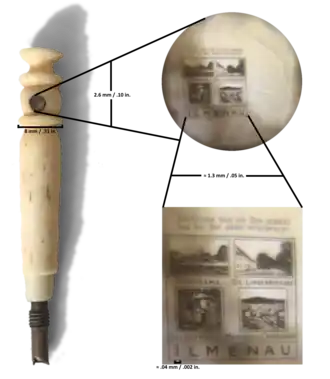 A stanhope or stanho-scope is an optical device that enables the viewing of microphotographs without using a microscope.[1][2] They were invented by René Dagron in 1857.[1] Dagron bypassed the need for an expensive microscope to view the microscopic photographs by attaching the microphotograph at the end of a modified Stanhope lens.[1] He called the devices bijoux photo-microscopiques or microscopic photo-jewelry.[3]