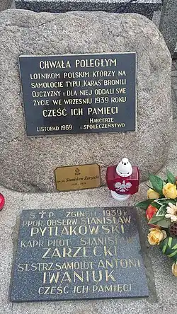 The fallen airmen were initially buried in an unmarked grave approximately 100 meters from the crash site.[20] Between 1939 and 1941, their remains were transferred to the parish cemetery in Poświętne.[21][22] A cross was erected at the grave with a plaque reading: "Here rest the airmen who died fighting for Polish soil".[23] In the 1960s, Czesław Adamiuk, a teacher and leader of the 57th Polish Scouting and Guiding Association troop named after Janek Krasicki in Poświętne, initiated the "Płyta" campaign to restore the grave and identify the buried airmen.[22][24] In November 1969, a 2.5-ton stone, funded by the monument construction committee, was placed at the grave.[25][26] At the time, the airmen's identities were unknown (confirmed only in 1977 through historian Adam Popiel's efforts), so the plaque read: "Glory to the fallen Polish airmen who, on a ‘Karaś' aircraft, defended the Homeland and gave their lives for it in September 1939. Scouts and the community".[26][27] After the identities were established, Bolesław Kowalski, a stonemason from Kobyłka, crafted a new plaque with the airmen's names and refurbished the grave.[1] Annual patriotic ceremonies at the grave of the September 1939 soldiers have since gathered schoolchildren and local residents.[26][28]