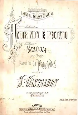 In 1882, Gastaldon wrote "Ti vorrei rapire" (I want to carry you away), a sequel to "Musica proibita" which is meant to be sung by the young man referred to in the original song. Like "Musica probita", the text was by "Flick-Flock". It had considerable success in its day and was recorded in 1910 by the Italian baritone Taurino Parvis for Columbia Records.[22] A variation on the theme came in 1885 with Gastaldon's "Musica non probita!" (Music not forbidden!) composed to a text by the theatre critic and poet Luigi Bevacqua Lombardo. Two of Gastaldon's other early songs, "Amor non è peccato" (Love is not a sin) and "Fiori di sposa" (Bridal flowers) were set to texts by a poet identified only as "Faustina". The first of these was dedicated to Leonora Genina Mancini, daughter of the Italian statesman Pasquale Stanislao Mancini and the poet Laura Beatrice Mancini. Leonora's younger sister Flora ran a famous musical salon, and both sisters wrote poems that had been set by Gastaldon's contemporaries.[23]