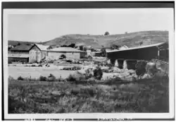 The Stanislaus was as productive a gold-bearing stream as any in California; in the early days of the Gold Rush it was known as the "Southern Mines" because it was at the time the southernmost extent of the primary gold diggings. In 1848 William R. Ryan wrote that the mining camps along the Stanislaus River were "all of the poorest and most wretched description. Miners expected to profit within a short time and then leave these primitive conditions and return to their homes. There were numerous tents, good, bad, and indifferent, stores and gambling booths, shanties and open encampments; and miners busy everywhere."[56] Initially, miners worked individual placer claims, but as the easily accessed gold played out, they teamed up to build extensive dam, ditch and flume systems that could more efficiently wash gold out of sediment, as well as supply water to gold-bearing areas without a water source and provide water for irrigation. These represent some of the earliest water rights claims along the Stanislaus River.[55] Many mining camps were established on the Stanislaus River including Tuttletown, also known as the "Mormon Camp" (some of the first prospectors came from the unsuccessful colony at Stanislaus City) and Melones, named for gold that was "so coarse" that it reminded the miners of "melon seeds".[57]