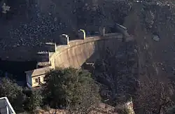 Shortly after their formation, the districts issued $1.9 million in revenue bonds to finance the dam and canal infrastructure that would supply the land.[87] In 1913 the districts built Goodwin Dam, about 2.5 miles (4.0 km) upstream of Knights Ferry, to divert water into their respective canals. They filed claims for 600,000 acre-feet (0.74 km3) of Stanislaus River water, divided evenly between the two districts. In the early years, maintaining a sufficient water supply in the summer was nearly impossible, because the Sierra snowpack usually melts out by mid-June. Agriculture relied heavily on wells in the late summer when the river was low, and this could only support about 20,000 acres (8,100 ha) of crops. The lower Stanislaus River was often completely dry in the summertime due to water diversions.[88] The irrigation districts desperately needed water storage for the dry season, and a number of small off-stream reservoirs were built, including Woodward Reservoir in 1916, though their benefit was limited at best.[81] In 1925 the districts issued $2.2 million of bonds to build a storage dam on the Stanislaus River.[83] The original Melones Dam, completed 1926, was a 211-foot (64 m) tall concrete arch structure capable of storing 112,500 acre-feet (0.1388 km3) of water, enough to irrigate 144,000 acres (58,000 ha) of land for a single season but too small to provide carry-over storage for drought years.[81][89]
