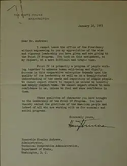 He was appointed special consultant to the Secretary of State in December 1951 to complete the mission of Dr. Henry Bennett (killed in an airplane crash in Iran). In April 1952 he became administrator of the Technical Cooperation Administration.[6] Andrews remained administrator of the Technical Cooperation Administration until September 1, 1953, when he resigned. He then moved to the Kellogg Foundation to administer the National Project in Agricultural Communications, working there until March 1960.[2][3]