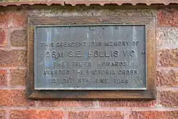 Another statue of Stanley Hollis was erected in Crépon, Normandy, France near the Green Howard Pub. Hollis Court, a retired/sheltered accommodation complex in Coulby Newham, Middlesbrough, is named after him.[19] His Victoria Cross was bought by medal collector Sir Ernest Harrison OBE, chairman of Racal and Vodafone. Harrison presented the medal to the Green Howards Regimental Museum in Richmond, North Yorkshire in 1997. Ten years later, he purchased, for the Green Howards, the Normandy hut which Hollis had attacked.[20]
