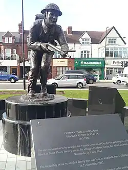 A statue honouring him, sculpted by Brian Alabaster ARBS, was unveiled on 26 November 2015 by Vice Lord Lieutenant of North Yorkshire, Peter Scrope.[17] The walk-in memorial is located close to the Middlesbrough cenotaph outside the gates of Albert Park in front of the Dorman Museum.[18]