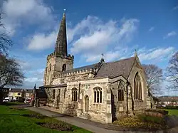 Stapleford's origins can be traced to before the Norman Conquest.[9] In the churchyard of St Helen's church is the Stone Cross which is Saxon and believed to be the oldest Christian monument in the Midlands.[10] Stapleford owed its development in part to its closeness to the River Trent and the River Erewash as the town became a point of trade. The antiquary John Weever defined a staple town "to be a place, to which by the prince's authority and privilege wool, hides of beasts, wine, corn or grain, and other exotic or foreign merchandize [sic] are transferred, carried or conveyed to be sold."[11] The area also expanded in the late 18th century when the stocking hose trade thrived in the Midlands. Evidence of this history can be found today with the original Stocking Knitters' Houses still standing alongside more modern properties and shops such as on Nottingham Road. The main crossroads in Stapleford at the junction of Nottingham Road, Derby Road, Toton Lane and Church Street is called The Roach. The name is from the time when French prisoners from the Napoleonic Wars were set the task of cutting through rock to create roads and this was referred to as La Roche.[12]