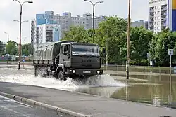 Star 266 is a basic medium-capacity transport vehicle of the Polish Armed Forces and as such is used for a number of different tasks. Polish Army also uses the modernized variant of Star 266 known as Star 266M. Star 266 also served as basis for a number of different vehicles including CD-5 tanker trucks which are used for transport of liquid fuel by supply platoons of tank and mechanized battalions, GD-2 smokescreen generation vehicles, truck-mounted cranes, excavators, WUS-3 and IRS special vehicles used for disinfection and chemical recon, deactivation and decontamination of vehicles, terrain, equipment and buildings, ADK-11 command vehicles as well as Star-266 AP-64 and Star-266 BP-64 special transport vehicles used for transporting the elements of the PP-64 Wstęga pontoon bridge.[3][4][5]