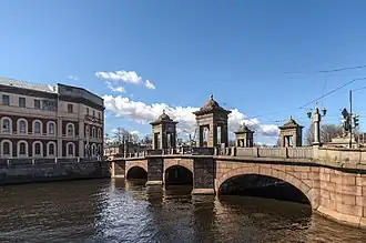 Staro-Kalinkin Bridge is a bridge across the Fontanka River in Admiralteysky District, Saint Petersburg. It connects Kolomensky and Bezymyany Islands. Along with Lomonosov Bridge it is one of 7 stone three-span bridges across the Fontanka built in the 1780s, which have survived to this day.