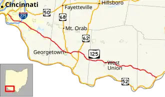 State Route 125 (SR 125) is an east–west state highway in the southwestern portion of the U.S. state of Ohio. Its western terminus is within the Cincinnati city limits, about 5 miles (8.0 km) east of downtown, at U.S. Route 50 – this is also the western terminus of State Route 32 and the southern terminus of State Route 561. The route’s eastern terminus is at U.S. Route 52 approximately 7 miles (11 km) west of Portsmouth near the village of Friendship.