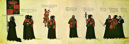 Tudor and Jacobean State funerals had a strongly heraldic flavour (this in fact had been a distinguishing feature of both royal and noble funerals since the Late Middle Ages). The Exchequer customarily provided all those taking part in the procession (from 'poor men' and servants to nobles and royalty) with lengths of black cloth for their mourning garb. Noblemen in particular wore full-length black mourning cloaks, and hoods drawn down over their faces; while noblewomen (who played a key role in the funeral processions for a female monarch or consort) wore a long straight gown with a trained surcoat, coupled with a white wimple-like head covering.[4] The quality and amount of material in these garments was strictly regulated by the College of Arms, according to the rank of the wearer: thus, a seventeenth-century Duke was permitted 16 yards of fabric at 10s a yard, a Knight only 5 yards at 6s.8d.[23]