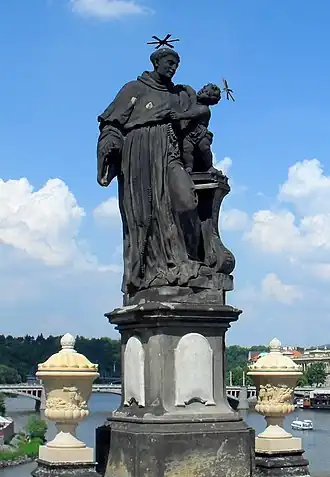 The statue of Anthony of Padua (Czech: Socha svatého Antonína Paduánského) is an outdoor sculpture by Jan Oldřich Mayer, installed on the north side of the Charles Bridge in Prague, Czech Republic.