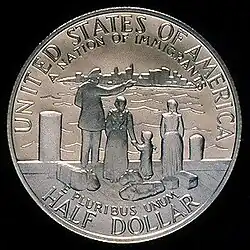 The obverse of the Statue of Liberty half dollar, designed by Edgar Z. Steever, features a view of the Statue of Liberty in 1913 with an immigrant ship in the background. The reverse, designed by Sheryl J. Winter, depicts an immigrant family viewing America from Ellis Island.[1][5]