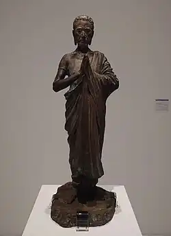 The Buddha dignifiedly stands with palms folded, pulling a drooping robe to form two pulling forces. The two forces are closed by a rounded hem and a pair of bare feet, balanced and open.[3][7] Huang created the statue by first making a clay sculpture and then turning it into a plaster statue, which was used as a mold to carve it out of wood.[7][8]