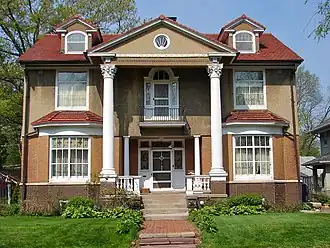 Stauduhar designed his own home in 1895 utilizing an eclectic style with Free Classic influences.[3] It features a tile roof, a Classical pediment that sits on top of two-story columns, rounded bays, twisted copper downspouts and different window shapes used throughout the structure. Originally the second and third stories were covered in cedar shingles. They were replaced by stucco after a 1918 fire.[3] On the interior the dining room features a barrel-vaulted ceiling and elaborate woodwork in the entry hall.