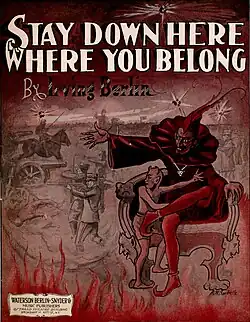 "Stay Down Here Where You Belong" is a pacifist novelty song written by Irving Berlin in 1914, presumably in opposition to the Great War. The lyrics describe a conversation between the devil and his son, the devil exhorting him to "stay down here where you belong" because people on Earth do not know right from wrong.[1]