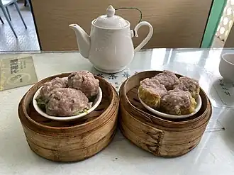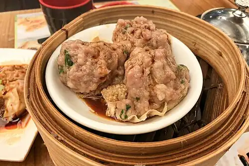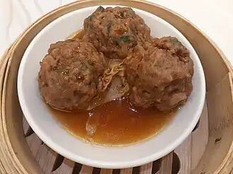 Steamed meatball (山竹牛肉) is a common Cantonese dim sum dish.[1] It is popular in Hong Kong and most overseas Chinatowns. The meatballs are usually made of minced beef, with water chestnut to add texture and with coriander and a few slivers of chan pei or dried orange peel used as seasoning. A layer of tofu skin, or sometimes peas, are used to raise the meatballs from the bottom of the dish and prevent them from sitting in the cooking juices. It is generally served with Worcestershire sauce (Chinese: 喼汁; Jyutping: gip1 zap1; Cantonese Yale: gīp jāp; pinyin: jiézhī).