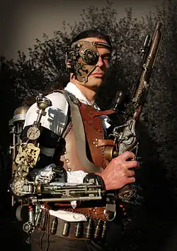 Steampunk fashion is a subgenre of the steampunk movement in science fiction. It is a mixture of the Victorian era's romantic view of science in literature and the industrialisation in most parts of Europe. The aesthetics of the fashion are designed with a post-apocalyptic era in mind.[1] At the first steampunk convention, "SalonCon", in 2006, steampunk enthusiasts dressed up in costumes reflecting that era. The costumes included clothing, hairstyling, jewellery, body modification and make-up. Steampunk fashion has later gone on to include gadgets and contrasting accoutrements.[2]