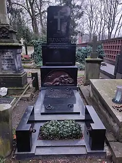He is buried at the Powązki Cemetery (section 170-6-25); a tombstone decorated with a bas-relief "Sadness" - by pl:Leon Szatzsznajder.