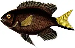 Stegastes pictus, the yellowtip damselfish, is a species of damselfish found near the sea bed on shallow rocky reefs off the coast of Brazil, where it is endemic.[3] It is a small, laterally-compressed, dark brown fish with yellow pectoral and caudal fins. It feeds on algae and detritus and is often found in the vicinity of the fire coral Millepora alcicornis. It is a territorial fish and forms a pair bond in the breeding season. The eggs are laid in a shallow scoop on the seabed and the male tends them to keep them well-aerated.