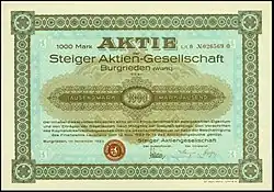 In 1922 Steiger produced a two-seated roadster with a larger engine (cubic capacity 2.8 litres, 55 hp / 40 kW) that became available in 1924 as an even more powerful model (cubic capacity 2.9 litres, 70 hp / 51 kW). These types reached a maximum speed of 140 km/h (88 mph) (100 hp racing models could reach a speed of 180 km/h (113 mph))[3] and cost 18,000 Reichsmarks. Those high-performance sports and racing models were very successful at racing events (Solituderennen, Avus, Eifelrennen, Klausenrennen, Monza and Targa Florio) in the 1920s.[4] The more powerful touring car, the Steiger 11/55 PS, arrived in 1925 with an extended wheelbase and the first sports car's engine.