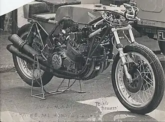 Towards the end of the 50s, while continuing to work in the aviation industry, the Belletti Workshop began to establish important relationships in the motorcycle racing industry, working closely with Eng. Lino Tonti, building motorcycle frames for racing competitions. Some of the first frames were built for Paton in Milan, who they continued to work with until 1973. Paton motorcycles with Belletti frames, or replicas of the same, are identified with the initials BL, as can be seen in the BL3-R model which is still in production today. Starting in the 60s, other important brands such as Linto, Puch Frigerio, and Guazzoni begin to commission the Belletti family to build prototypes and special motorcycle frames for racing. One of the most significant achievements within the motorcycle industry dates back to 1967. That year, Mike Hailwood was to take part in the World Championship with a Honda 500 GP, but after the initial testing carried out that winter, the road racer began to complain about the performance of the frame. In 1967, the engineers at the Japanese company had been focused on developing the engine (which turned out to be among the most powerful in the Championship) and consequently decided not to make any further changes to the chassis. Referred by specialist Giuseppe Pattoni, Hailwood approached Stelio and Antenore Belletti as a private customer and commissioned them to construct a new chassis for his Honda 500 GP. They completed the tubular-steel double cradle frame in just 16 days. The Honda 500 GP motorcycle equipped with the new Belletti frame was used for the first time at the Mototemporada Romagnola, in the Rimini stage on May 14, 1967. The road racer won the race, breaking the winning streak of racer Giacomo Agostini who rode a MV Agusta. The motorcycle was also used in the World Championship while testing the Hockenheim circuit, but Honda forbade the use of the motorcycle during the race and for all subsequent races. In 1968, they also began construction on a limited series of frames to equip the Gran Prix motorcycle Linto 500 GP; all the frames for this model were designed by Belletti’s friend, Lino Tonti, and built by Belletti. The Belletti workshop continued to work in the motorcycle industry until the early 70s.