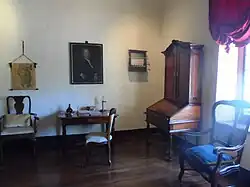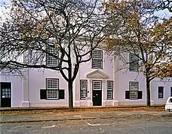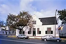 The Bleterman House in the museum complex depicts the period of c. 1789. The house was built by Hendrik Lodewyk Bletterman, Landdrost (Magistrate) of Stellenbosch from 1785 to 1795. This dwelling is a Cape Dutch H-shaped house and an example of a gabled house from the 18th century.[4] The site on which Bletterman House is situated was purchased by Hendrik Lodewyk Bletterman in 1787. Since the Hertzog plan of 1817 shows a building on this site, it is assumed that Bletterman built the house sometime before that date. After his death in 1824, the house was sold to the Landdrost and Heemraden, and was converted into offices and a courtroom, becoming the "Stellenbosch Public Offices". The outbuilding was renovated and equipped with 50 school benches and served as a school for slaves. The school was officially opened in September 1825, with Erasmus Smit as teacher. There is no record that the main house was ever used as a residence after Bletterman's death. The Stellenbosch Police used the buildings as their headquarters from about 1879–1969, when it was acquired by the Stellenbosch Museum.[5] The house is listed as a provincial heritage site.[6]