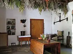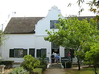 The Schreuder House is the first period house in the museum complex, and is furnished according to the period c. 1709. The house was built in August 1707 by Sebastian Schreuder, who was a German messenger of the court of the Dutch East India Company.[1] It is a pioneer cottage with a thatched roof and clay floor. Because window glass had to be imported from Holland, the windows are made of linen or gauze stretched over a frame with beeswax to seal the cloth against the elements. During a hard downpour, the housewife simply closed the outside shutters; in fine weather, the catches were released, the whole frame was lifted out, and fresh air was let in.[2] The house was declared a monument in 1974 and is currently listed as a Grade II Western Cape provincial heritage site.[3]