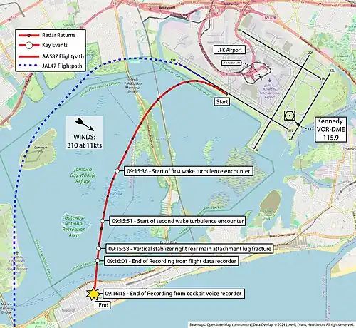 At 9:13:28, the A300 was cleared for takeoff and left the runway at 9:14:29, about one minute and 40 seconds after the JAL flight had departed. The aircraft climbed to an altitude of 500 feet (150 m) and then entered a climbing left turn to a heading of 220°. At 9:15:00, the captain made initial contact with the departure controller, informing him that the airplane was at 1,300 ft (400 m) and climbing to 5,000 ft (1,500 m). The controller instructed the aircraft to climb to and maintain 13,000 ft (4,000 m).[4]: 3 The flight data recorder (FDR) showed that the events leading to the crash began when the aircraft hit wake turbulence from the JAL flight in front of it at 9:15:36. In response to the turbulence, Molin moved the rudder from the right to the left and back again in quick succession from 9:15:52, causing sideslip until the lateral force caused composite lugs that attached the vertical stabilizer to fail at 9:15:58.[4]: xi, 135 The stabilizer separated from the aircraft and fell into Jamaica Bay, about 1 mi (1.6 km) north of the main wreckage site.