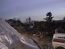 Five residents of Belle Harbor lost their lives in the crash:[38] Thomas (79) and Helen Concannon (73), an elderly married couple;[39] Kathleen Lawler (48) and her son Christopher Lawler (24) —a second-year law student at St. John's University—,[40] and Franco "Frank" Pomponio (45). Frank Pomponio's wife, daughter, and dog survived by escaping through the rear of their home, quickly navigating through billowing smoke. Frank, however, was directly struck and subsequently trapped while sleeping in the upstairs bedroom.[41] Moments later the family dog, Dakota (5), reportedly ran back into the wreck to find Frank. She disappeared in the flames but was found hours later in stable condition albeit with her paws severely damaged.[42] Frank is also survived by a son, Michael, who was attending SUNY Albany at the time of the incident. Evidently a close knit community, Kathleen Lawler's two surviving daughters, Katelyn and Jennifer, were attending Bishop Kearney High School alongside Frank's daughter, Jennifer Pomponio. All three were members of the school's varsity softball team. Jennifer was getting ready to leave for practice to join the Lawler sisters just before the plane struck. Kathleen is also survived by her husband, Thomas Lawler, and their son, Brendan Lawler.[40] Additionally, Frank Pomponio was a well-regarded and beloved coach of Bishop Kearney’s varsity softball team. Tragically, many students at Bishop Kearney had recently lost relatives in the 9/11 attacks which had occurred only two months prior. As reported by the New York Post, a total of 7 individuals linked to Bishop Kearney passed away in connection with both incidents.