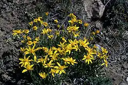 The inflorescence is a solitary 4-cm flower head[2] or small cluster of a few heads. The flower head contains yellow disc florets and 6–15 yellow ray florets each about 1.5 cm long; the bracts are pointed.[2]