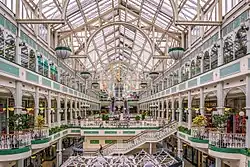 The site of the shopping centre was assembled over 15 years by the Slazenger family, beginning in 1966. In total, more than 150 individual property owners were bought out over that period. Most of the buildings were Georgian, and these were left to fall into disrepair and ruin as plans for an extensive redevelopment of the site as an office block and shopping centre totalling almost half-a-million square feet were drawn up. The original architects were Scott Tallon Walker, and planning permission for their scheme was granted in 1975. During the recession of the late 1970s, the small shops were rented out under a scheme known as "the Gaiety Green". At the weekends, this was marketed as the Dandelion Market, known for its alternative vendors, popular with younger people.[1] U2 played some of their earliest gigs at the market.[2] The market, which closed in 1981, is commemorated with a plaque, while Sinnotts Bar on South King Street is the only trader from the original site that remains.