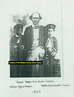 Stephen Arne Decatur Greaves was born on January 30, 1817, in Marion County, South Carolina.[2][3] He served as an officer in the Mexican War, ending his service as a Brigadier General.[1][4][3] In 1846, he became a member of the Mississippi House of Representatives, representing Hinds County as a Democrat.[4][1] After the war, he married Sarah Lowe around 1850 and moved to her 10,000-acre plantation, named "Sunny Place", in Madison County.[5] Before the American Civil War, they owned 600 slaves that worked on the plantation.[5] He died in Madison County, Mississippi, on November 17, 1880, aged 63.[2][4][5]